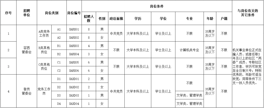 容西管委会公开招聘专职社区工作者35名,其中A类党务工作岗位16名,B类其他工作岗位7名,C类其他工作岗位12名。
