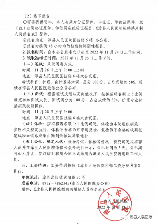 五、工资待遇:工资待遇按照《漳县人民医院内部工资分配方案》执行。